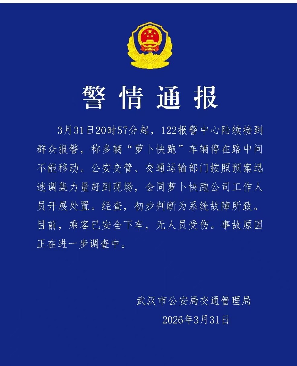 4月1日凌晨,武汉警方发布通报称,3月31日日20时57分起,122报警中心陆续接到群众报警,称多辆“萝卜快跑”车辆停在路中间不能移动。公安交管、交通运输部门按照预案迅速调集力量赶到现场,会同萝卜快跑公司工作人员开展处置。经查,初步判断为系统故障所致。目前,乘客已安全下车,无人员受伤。事故原因正在进一步调查中。