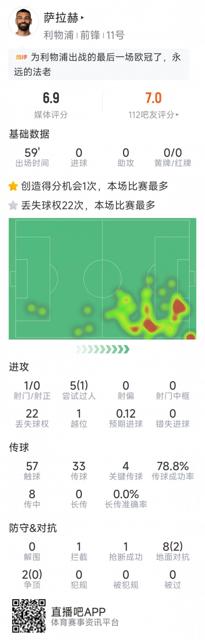 直播吧4月15日讯在欧冠淘汰赛次回合,利物浦0-2不敌巴黎,萨拉赫替补登场,以下为他在本场数据: